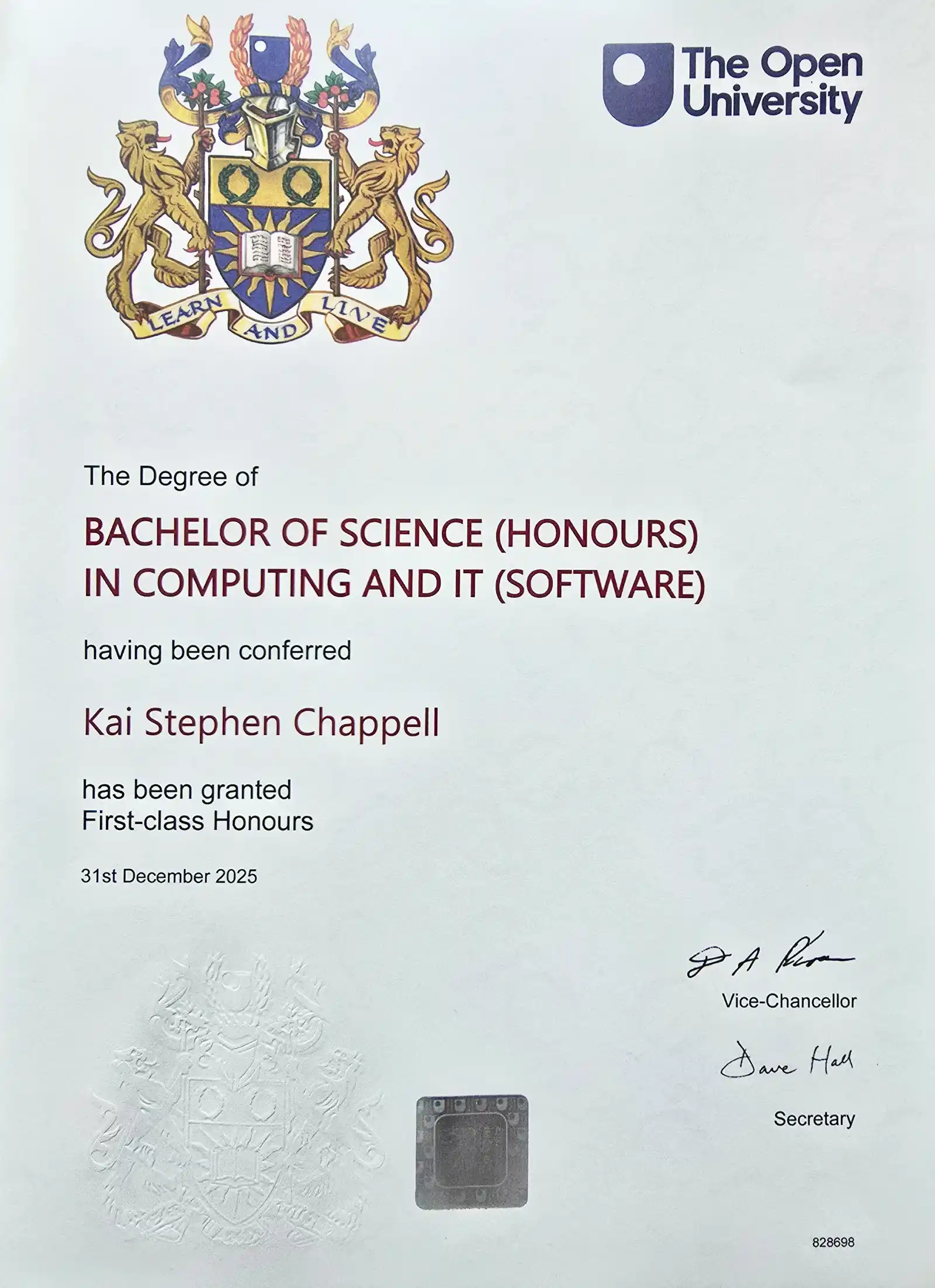 | TM470 | The Computing and IT Project | 6 / 3 | 2025 | Distinction |